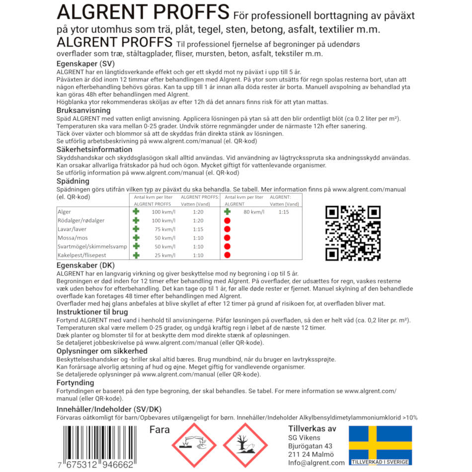 - 1 liter koncentrat av ALGRENT PROFFS räcker upp till 100m². Ger upp till 21 liter högeffektivt rengöringsmedel.