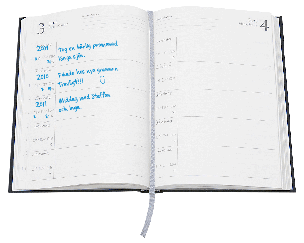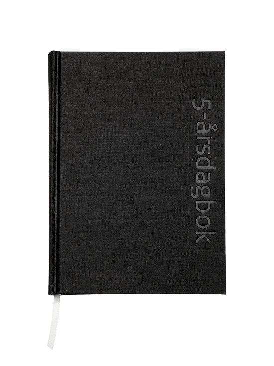 Inbunden 5-årskalender med en dag per sida med plats för anteckningar för de fem kommande åren.