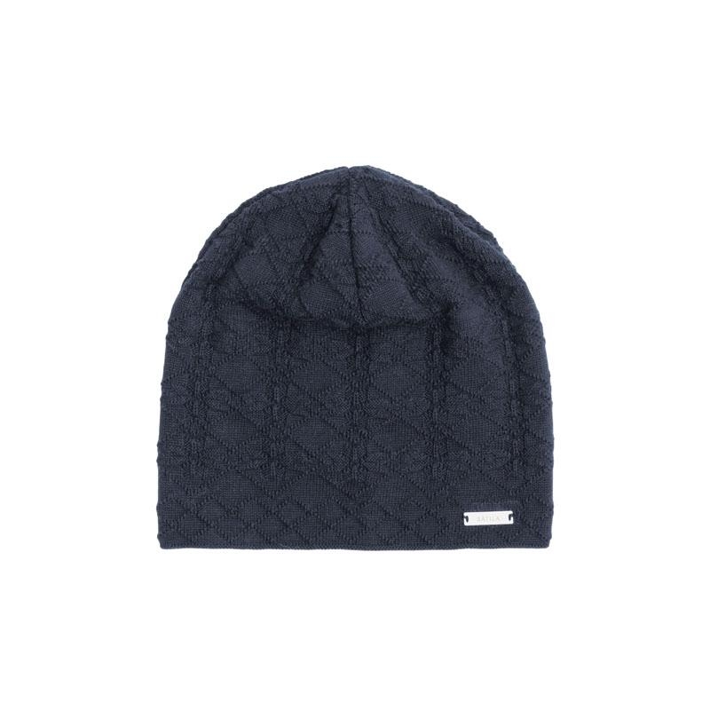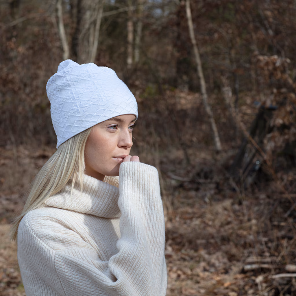 Anna är en något högre strukturstickad mössa med klassiskt nordiskt snöflingemönster. Tillverkad i 100% ekologisk bomull.