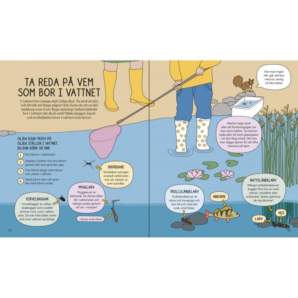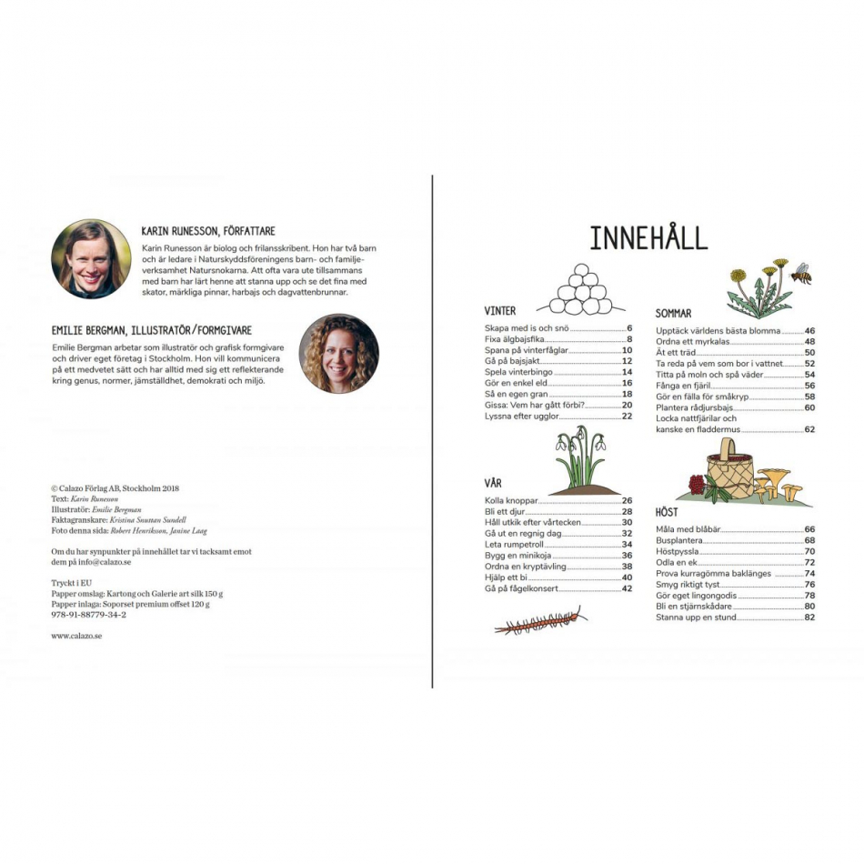 Den här boken är full av idéer och tips på utomhusaktiviteter som du kan göra tillsammans med dina barn. Boken är indelad i fyra kapitel efter de aktiviteter som passar bäst för varje årstid, även om mycket går att göra när som helst på året. Vid sidan av alla lekar, recept, odlingstips och pyssel får du många fascinerande fakta om stort och smått i naturen.