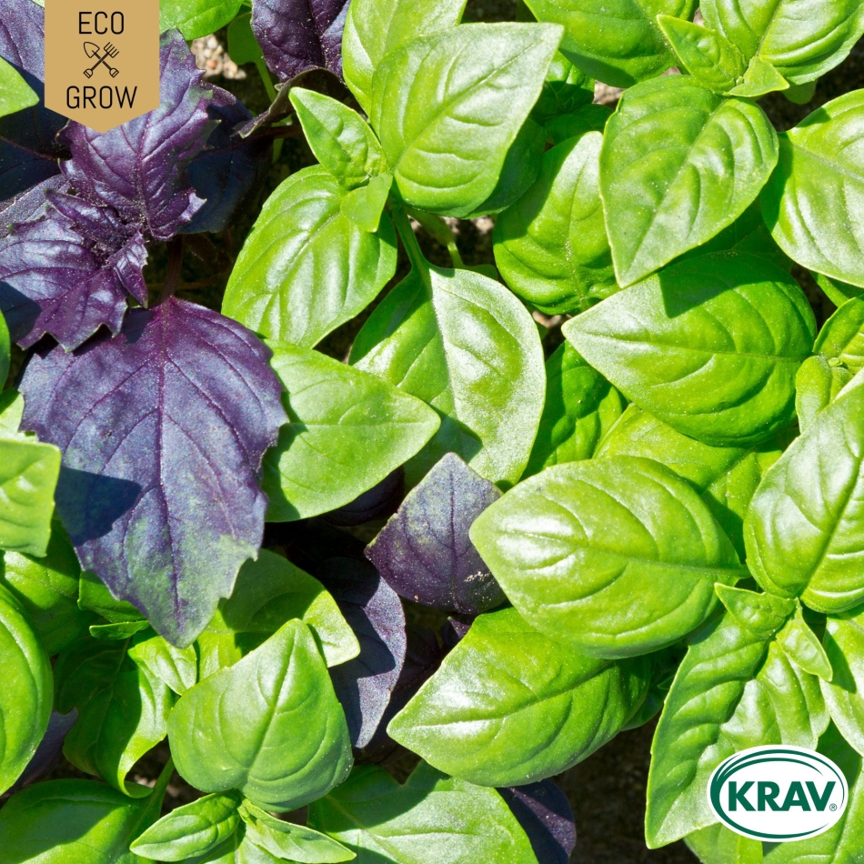 Basilika Mix Color Mix - är en härlig mix av grön och purpurfärgad basilika. De gröna bladen är stora och aromatiska med fyllig smak medan de purpurfärgade är blanka och lätt tandade med lite mer pikant smak. Den dekorativa mixen är vacker i rabatt eller kruka. Passar bra i sallader, såser eller marinader. De ljuslila och vita blomspirorna är både dekorativa och ätliga och uppskattas av pollinatörer.