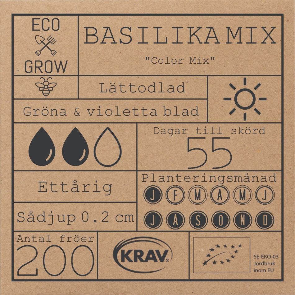 Ekologisk certifiering - Fröna är ekologiska, innehåller inga genmodifierade substanser (GMO) och dessutom har inga artificiella bekämpningsmedel eller kemikalier använts vid framtagning av fröna.