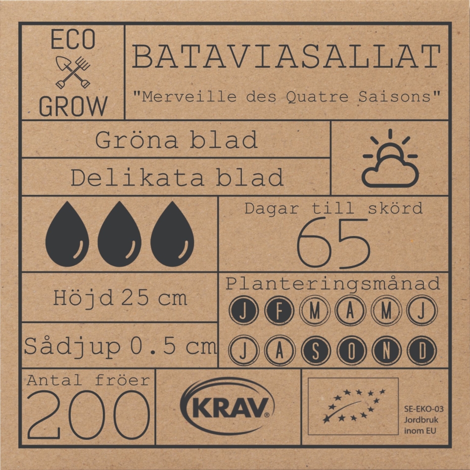 Ekologisk certifiering - Fröna är ekologiska, innehåller inga genmodifierade substanser (GMO) och dessutom har inga artificiella bekämpningsmedel eller kemikalier använts vid framtagning av fröna.