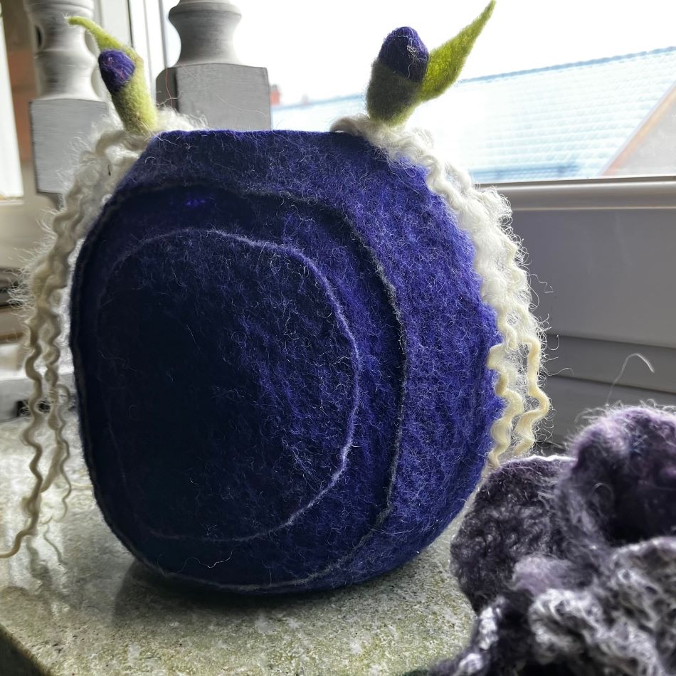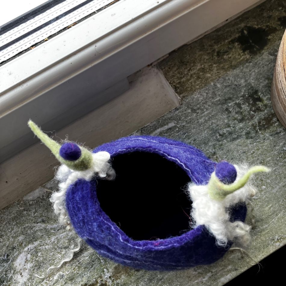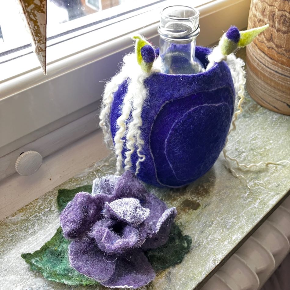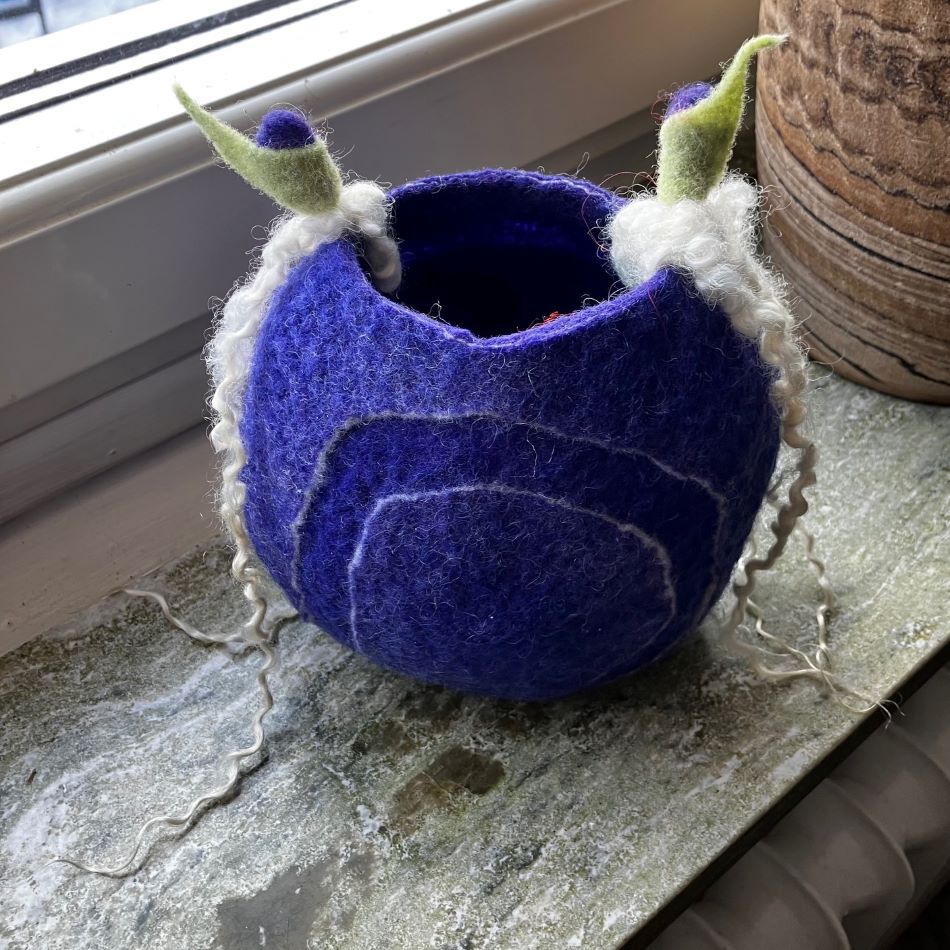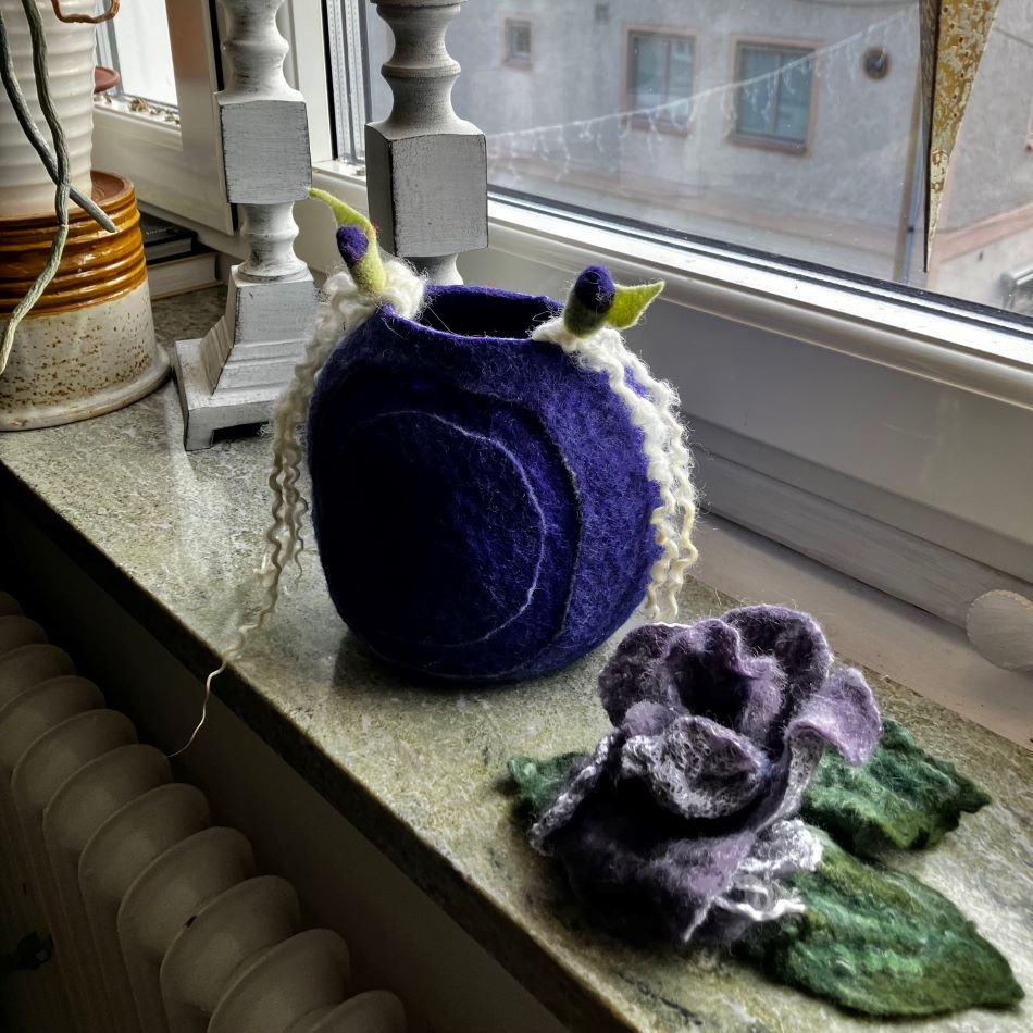 En vas i härlig blå färg. Tåttovad och med ett utskuret mönster vilket gör att man även kan använda vasen som ljuskälla. Det medföljer lite lockar och en vacker blå ros. Design Nettans Ullisar. Höjd cirka 15 cm
