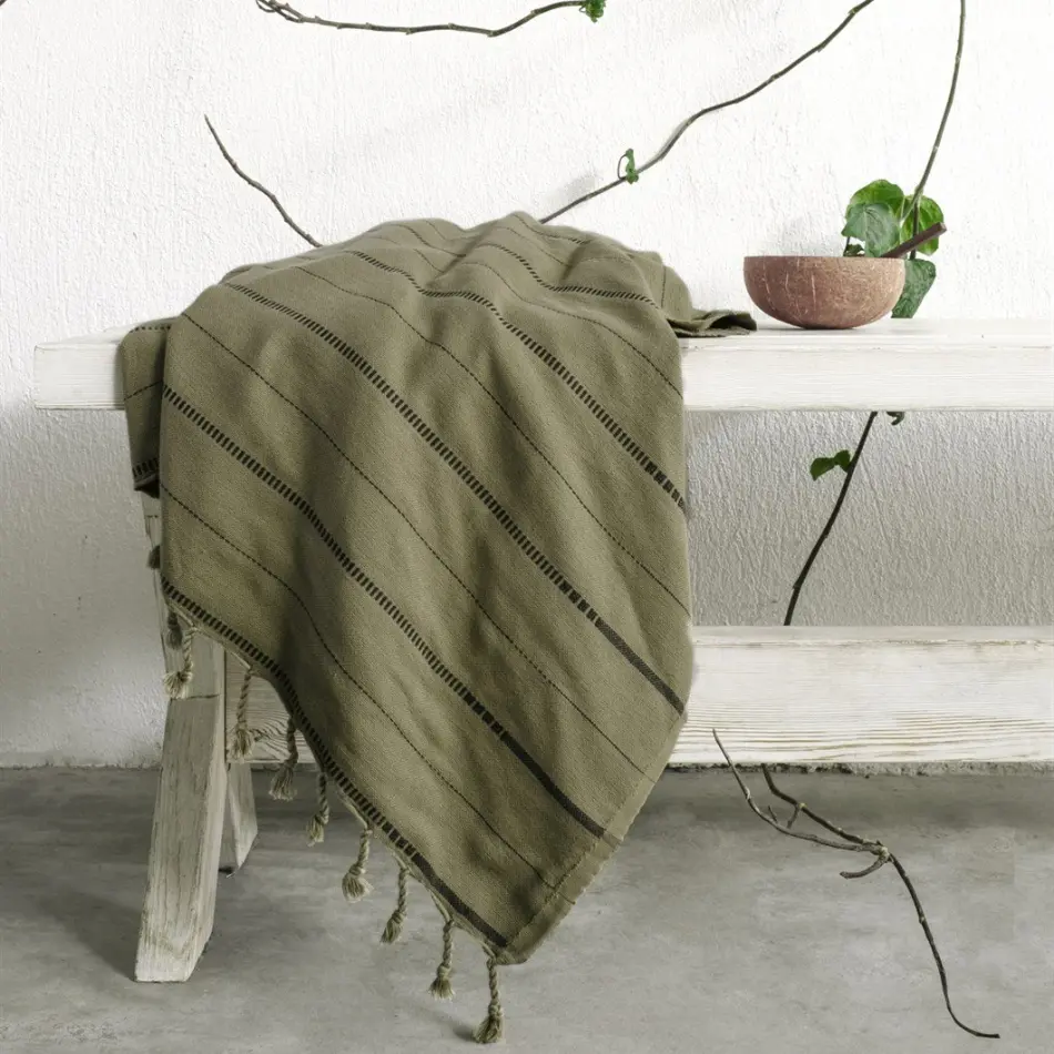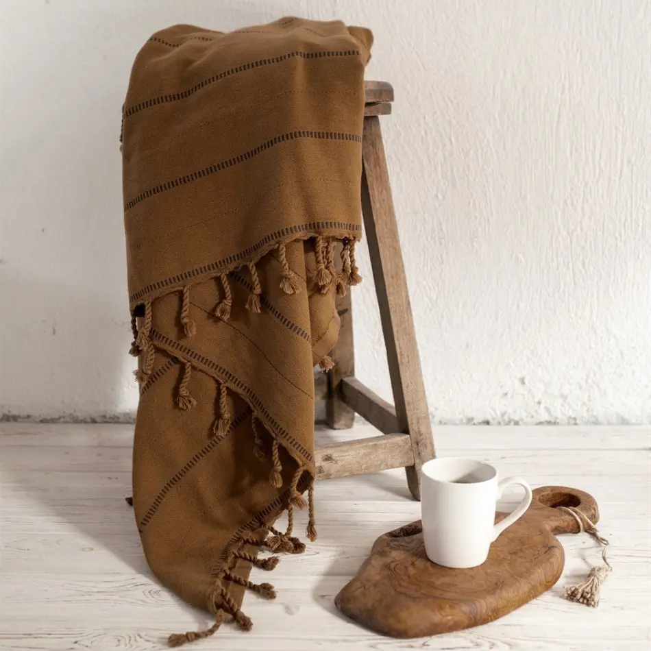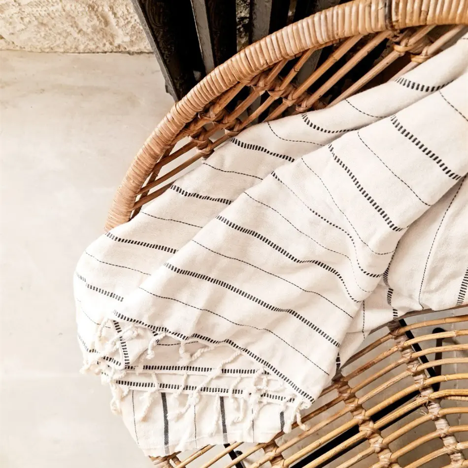 Fånga känslan av mys och skapa underbara stunder med Boa-filten - den perfekta följeslagaren för höstens värme eller sommarens milda kvällar. Med dess svala elegans och mjuka omfamning är denna filt en vänlig inbjudan till sköna stunder och värme. Dess handknutna fransar ger en elegant touch till ditt avslappningsutrymme - perfekt att njuta av i skenet av tända ljus.