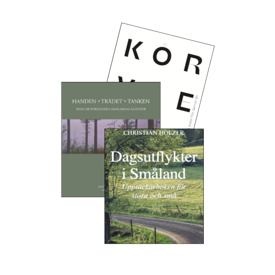 En tankeväckande bok om skogen och trähantverket, plus ett praktfullt verk om sevärdheter i nordöstra Småland plus en unik antologi med både kända (Suzanne Osten, Barbro Lindgren, Bob Hansson, m m) och nya författare.
