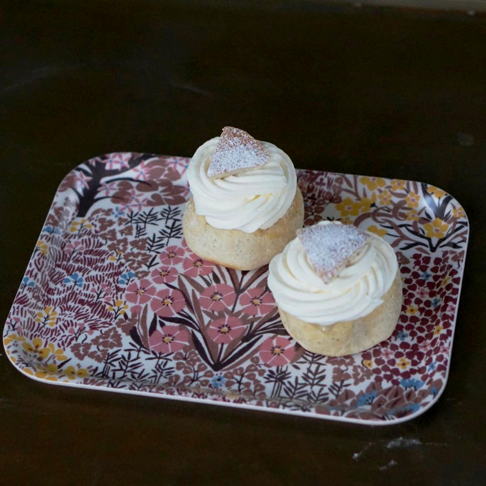 Årets nyhet i blommiga mönstret Botanic Garden i mjuka rosa och bruna nyanser passar så fint att servera fika på nu i vår och sommar.