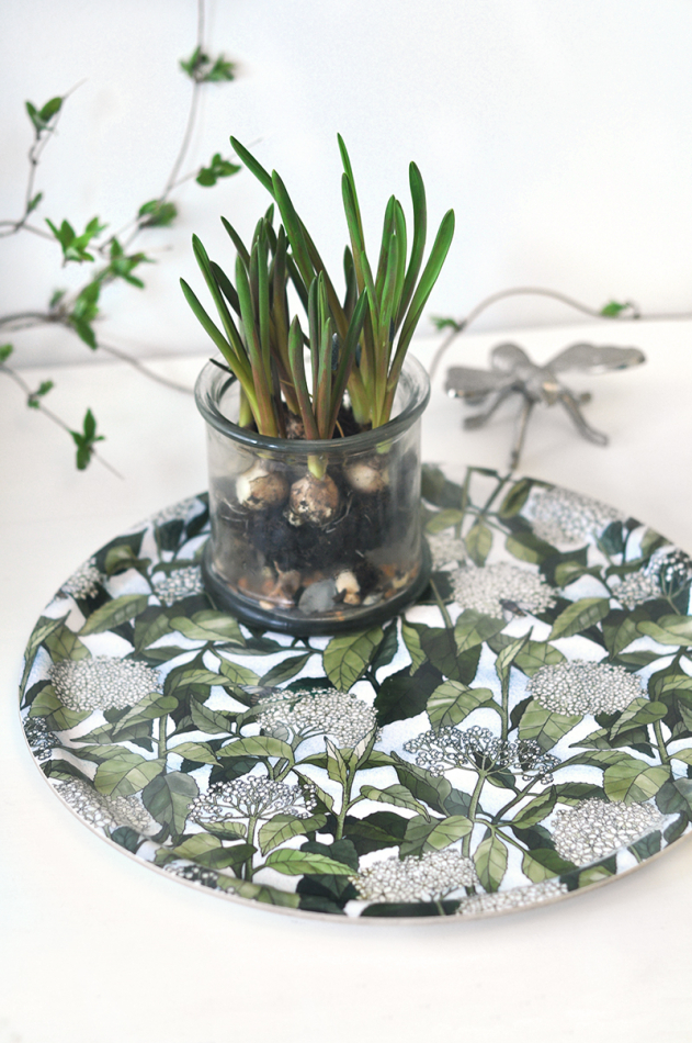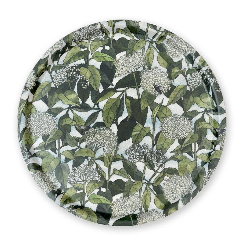 Bricka 38 cm i formpressat björkträ och mönster Fläder.