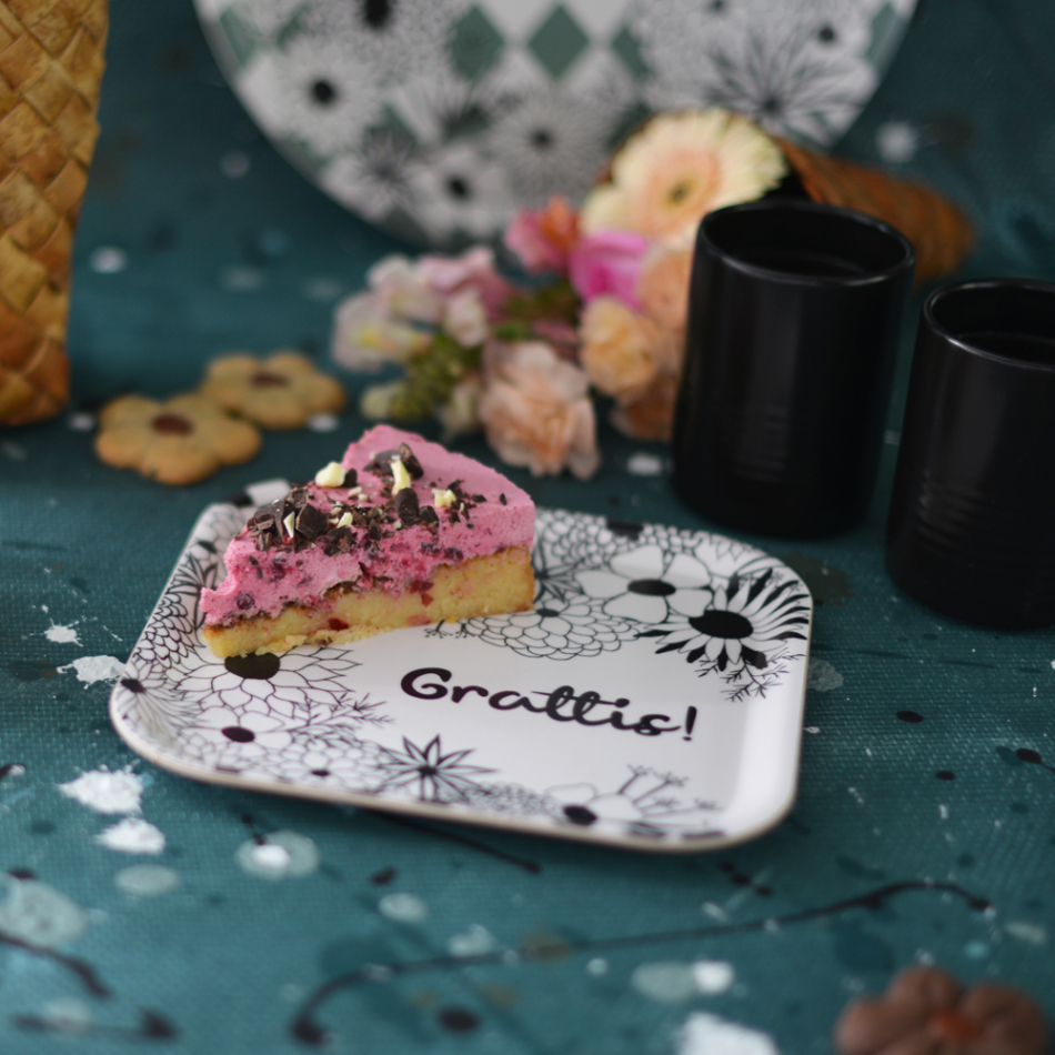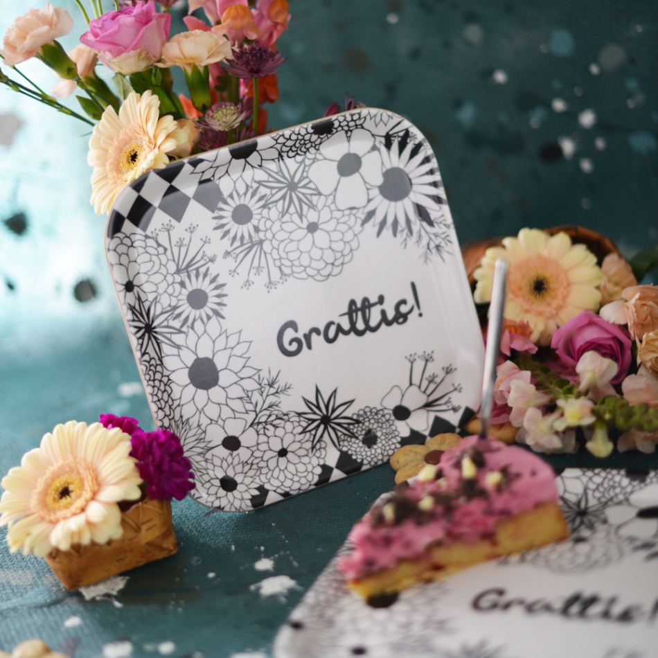 Liten kvadratisk bricka med text GRATTIS! och ett härligt blommönster. Perfekt för tex en födelsedagsfrukost eller nytt jobb-fika.
