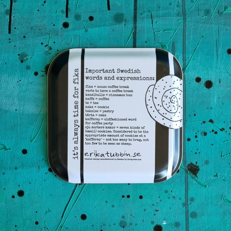 Kvadratiskt litet bullfat/bricka med kanelbullemönster. På baksidan finns ett litet lexikon (sve-eng) med viktiga svenska (fika)ord.