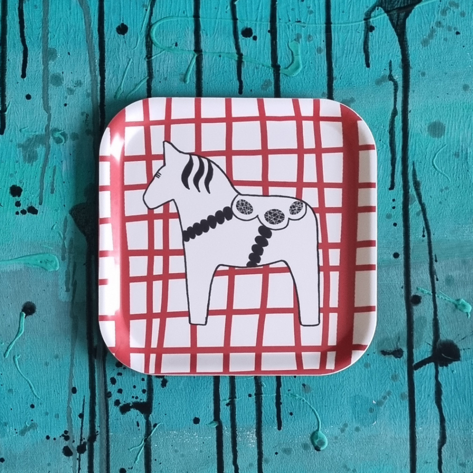 Liten kvadratisk bricka med trassligt ritad dalahäst - erika tubbin-style!