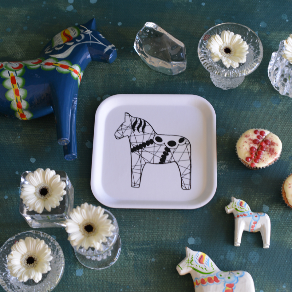 Liten kvadratisk bricka med trassligt ritad dalahäst - erika tubbin-style!