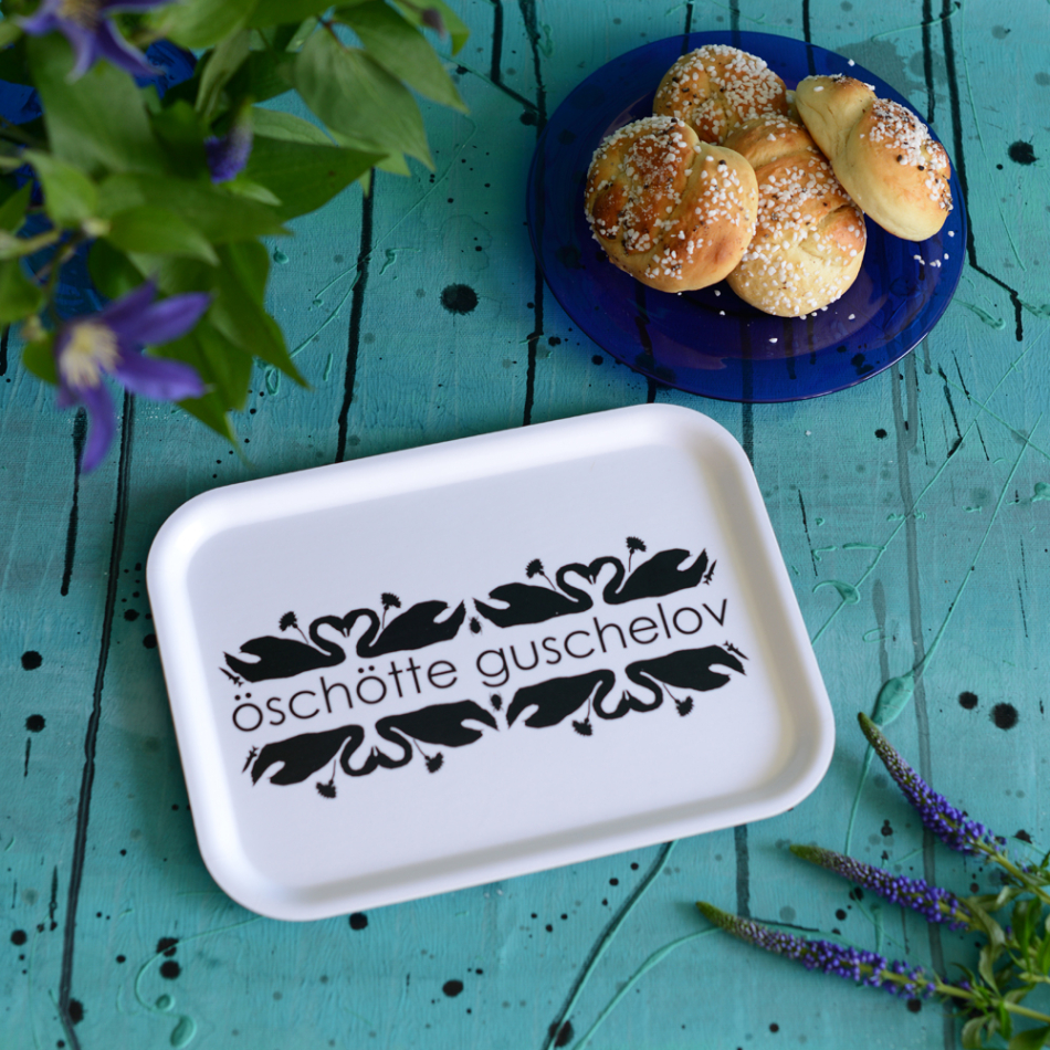 Perfekt fikabricka för öschötten! Rektangulär, svart och vit bricka med texten "ÖSCHÖTTE GUSCHELOV".