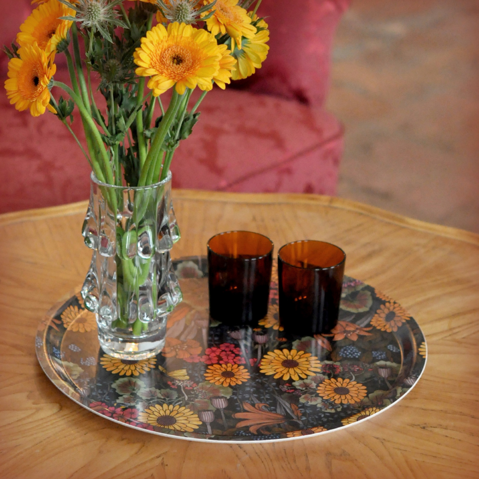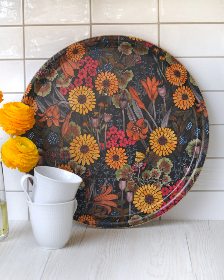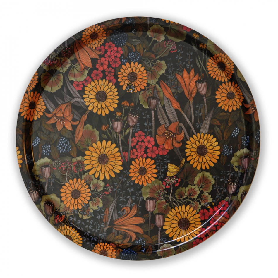 Bricka 38 cm i formpressat björkträ och mönster Ringblomsdans.