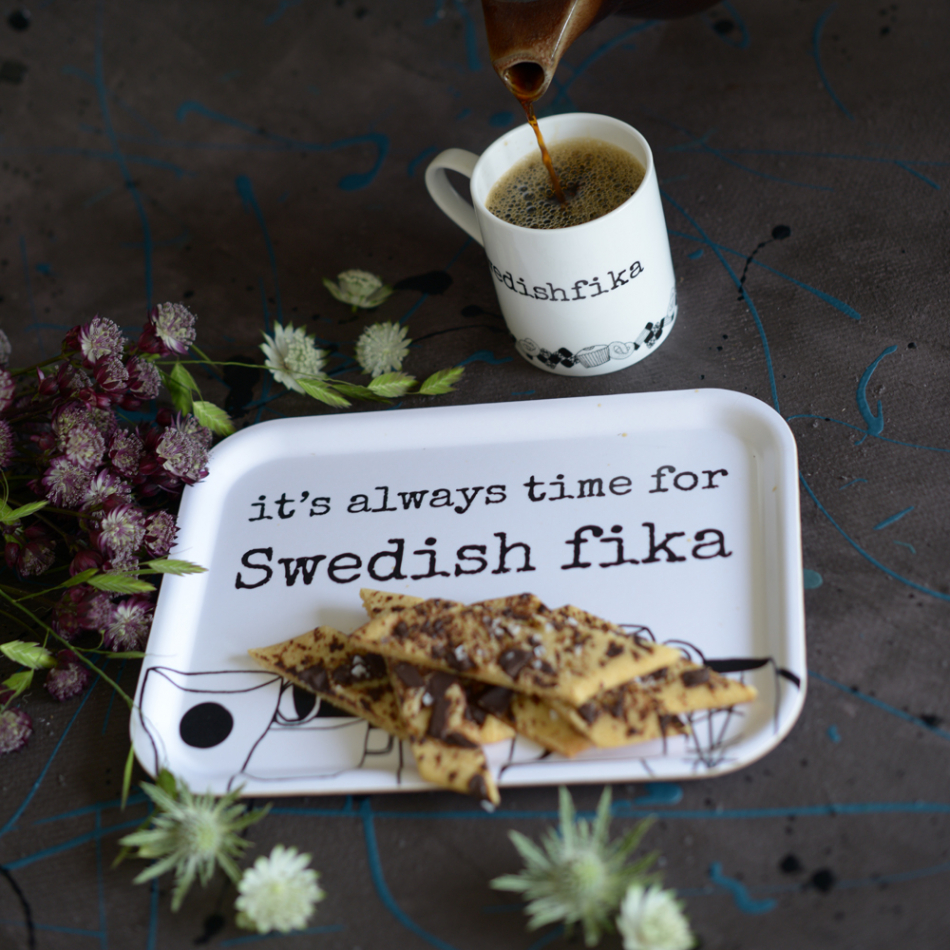 Rektangulär, svart och vit bricka med texten "it´s always time for Swedish fika". Brickan är tillverkad i Sverige.