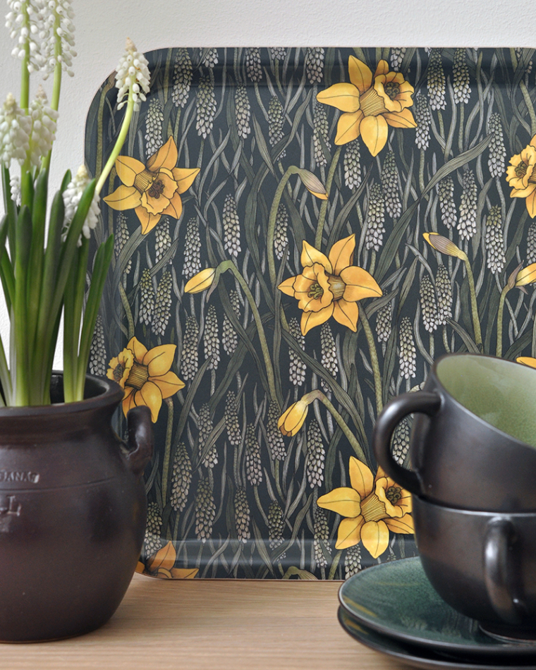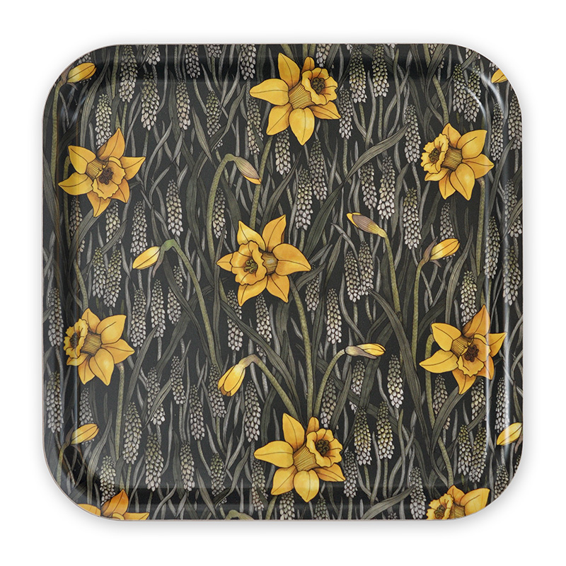 Bricka i formpressat björkträ och mönster Vårpärlor mörkgrön, med påskliljor och pärlhyacint.