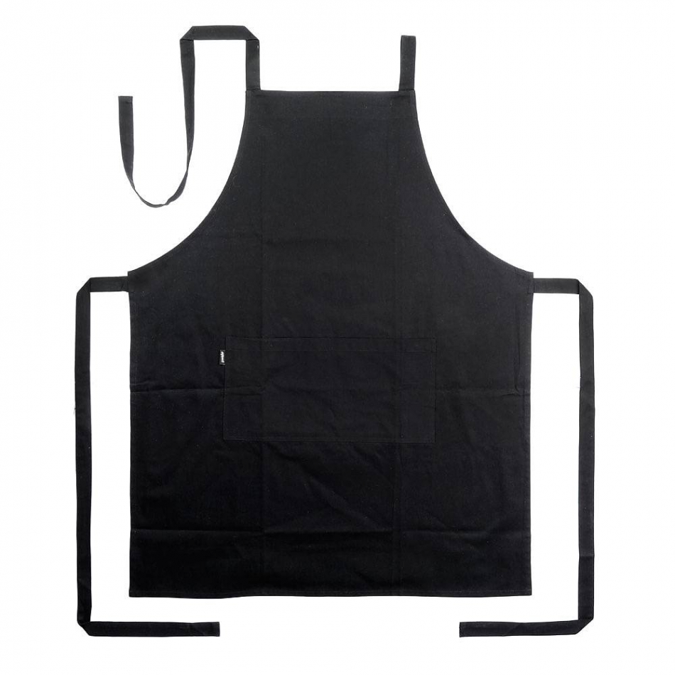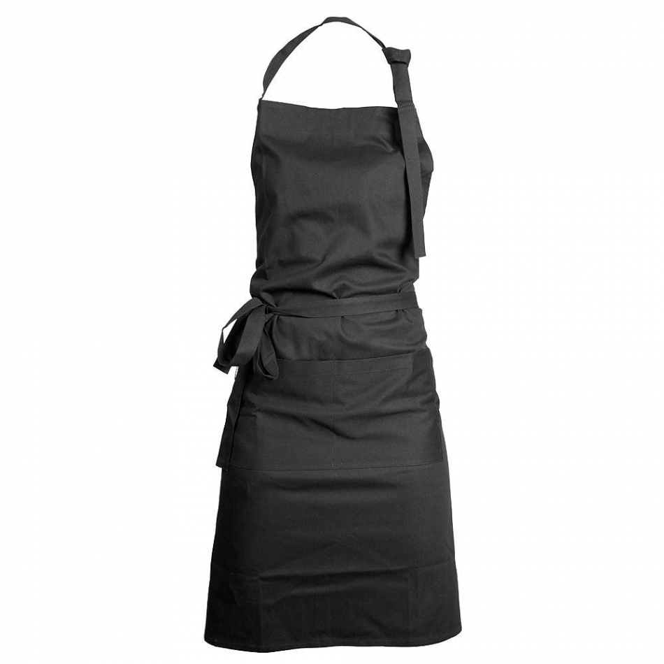 Svart bröstlappsförkläde med ficka tillverkat av 100% bomull Öko tex-certifierat.