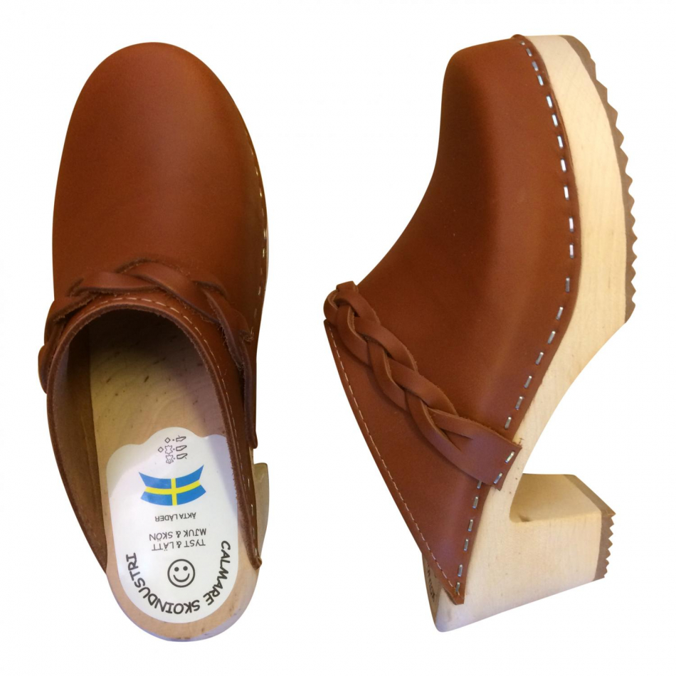 Naturlig lite högre träbotten i alträ med ca 7 cm hög klack, överdel i äkta natur/ljusbrunt läder.