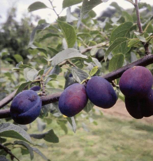 Litet träd som ger rikligt med små mörkblåa plommon med saftigt och sött fruktkött.