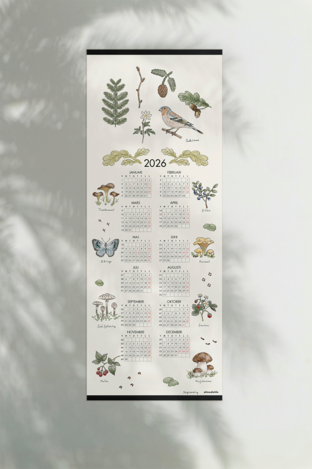 Skogsvandring kalender 2026 - väggkalender med handritade motiv från den svenska skogen. Kalendern är designad av vår egen designer Saki Urata.