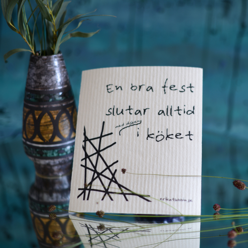 En rolig disktrasa piggar alltid upp! Text: "En bra fest slutar alltid (med disken) i köket".