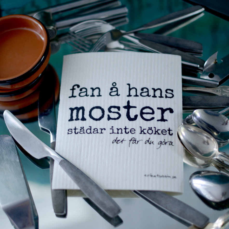 Disktrasa med tryck som får vem som helst att dra på smilbanden. Med en rolig disktrasa, som dessutom vågar ta till starka ord, blir det till och med kul att torka diskbänken. Texten på disktrasan lyder: "fan och hans moster städar inte köket - det får du göra". Ge bort i present till någon som hatälskar att städa eller köp som kökstrasa till ditt eget kök. Tvättbar disktrasa med svart text på benvit botten.
