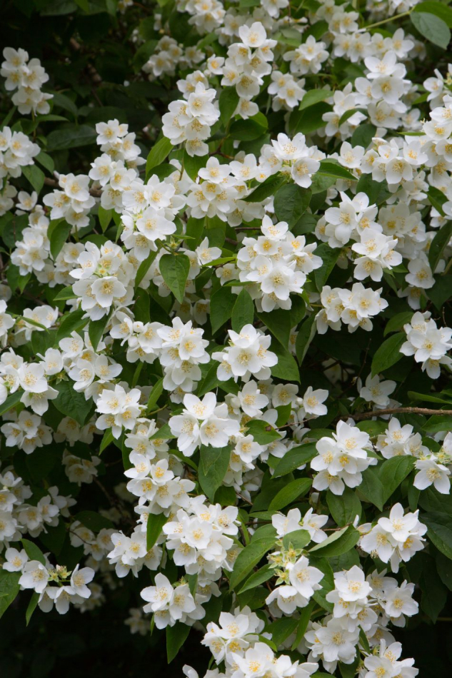 Philadelphus coronarius, doftschersmin med fantastiskt väldoftande krämvita blommor.