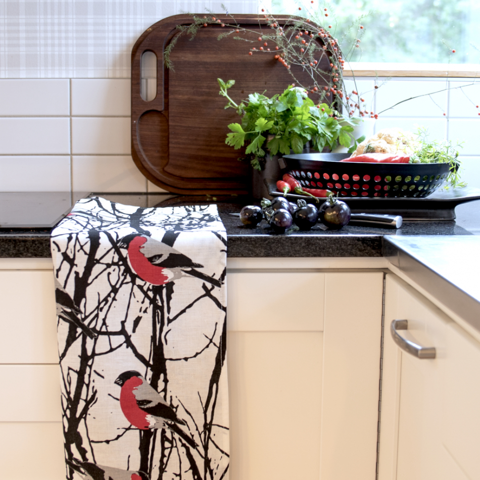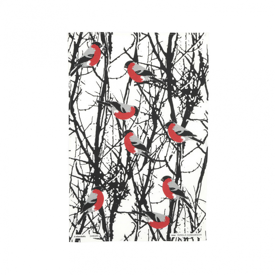 En av våra vackra fåglar, Domherren, har avbildats av designer Gunilla Gunnarsson. Du hittar mönstret på servetter, disktrasa, tygkasse och kökshandduk.
