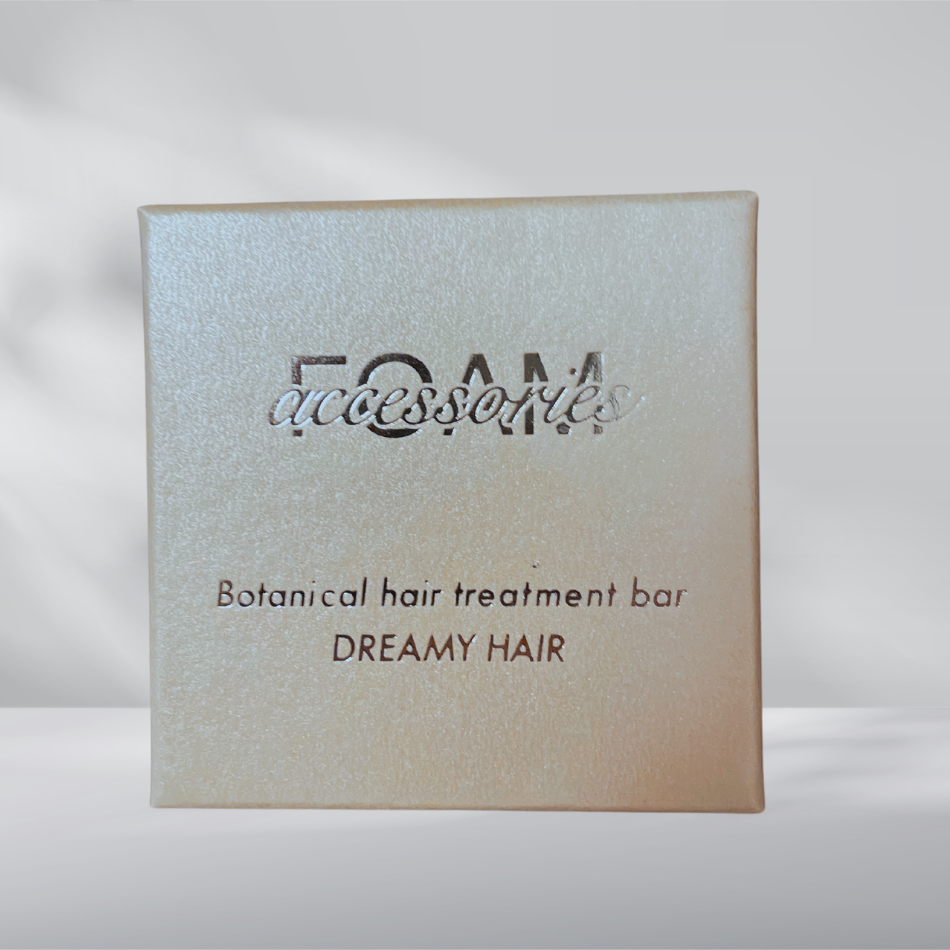 Dreamy hair från FOAM Accessories är en intensivt vårdande och reparerande balsamkaka. 100% naturligt och veganvänligt innehåll.
