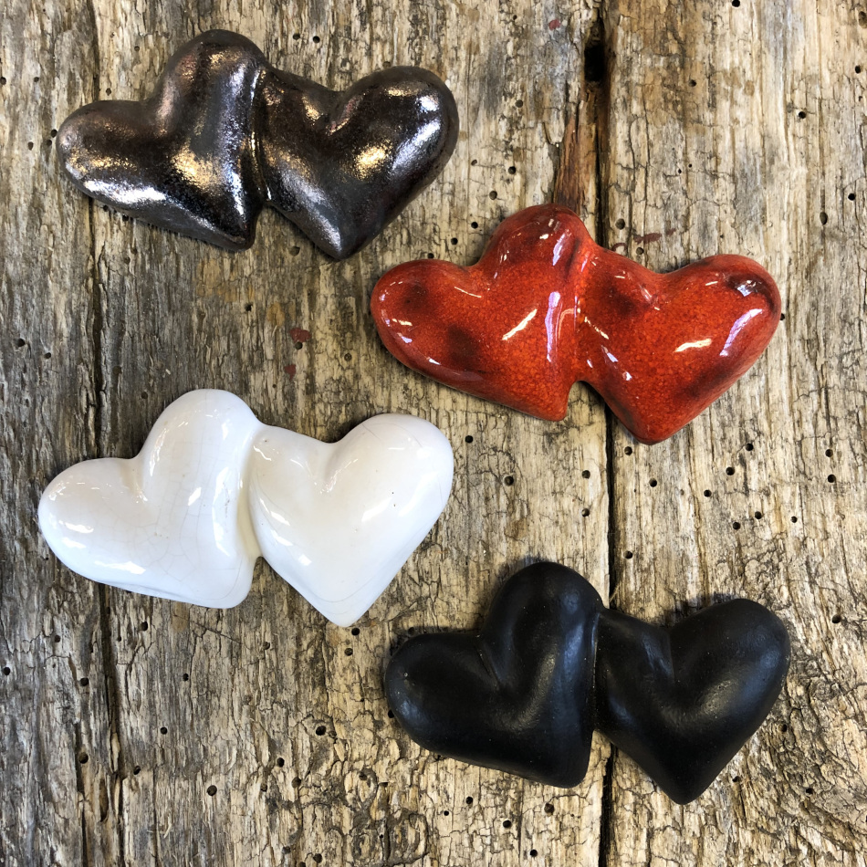 Två hjärtan som sitter ihop, tillverkade i keramik. Starka magneter på baksidan. Perfekta att ge bort vid olika tillfällen, praktiska på kylskåpet eller på våra memoboards i metall. Levereras i en liten ask i papper med snöre & etikett, färdig att ge bort som present om du önskar det.
