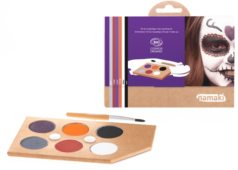 Färgstarka ansiktsfärger från franska Namaki. Måla dig till en vampyr, pumpa, skelett, monster, häxa, zombie och mer!