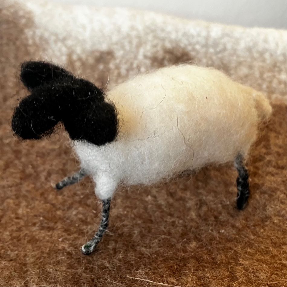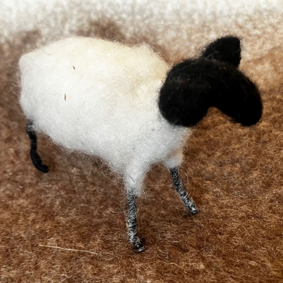 Handgjord nåltovat får på en stomme av ståltråd. Kardad vit ull av finullsfår från Uppland. Minifåret väger från 7 gram och är cirka 5 -7 cm hög och lång. Egen design av @nettansullisar varje får blir en unik individ. Svart huvud och ben, öronen är av våttovad filt.