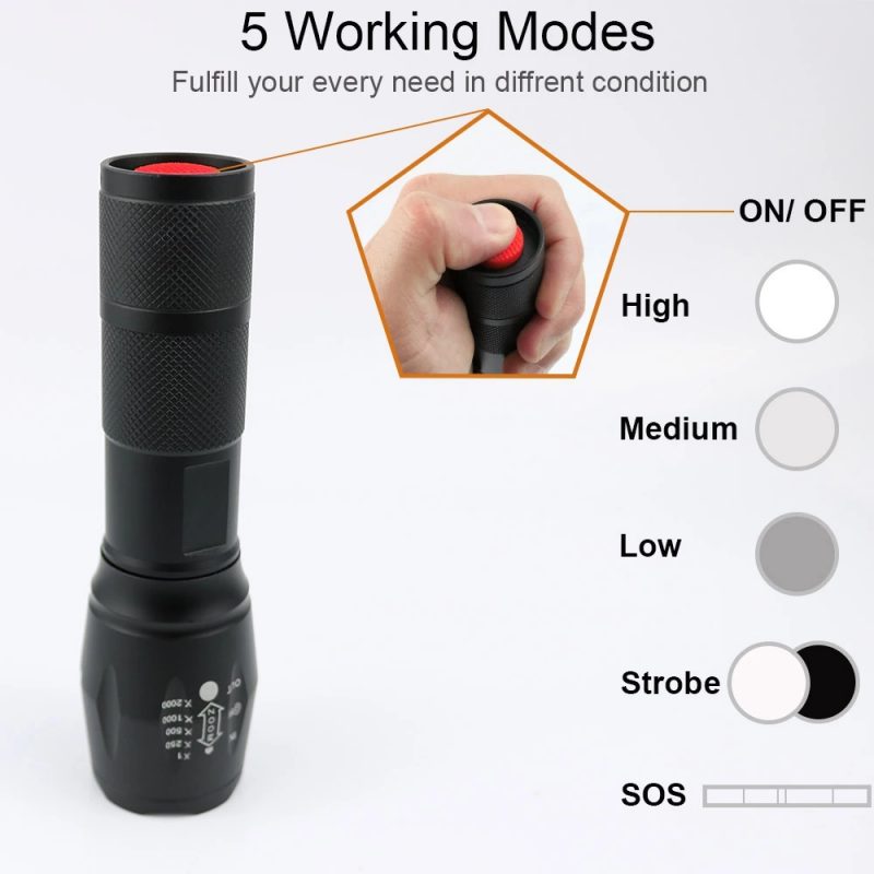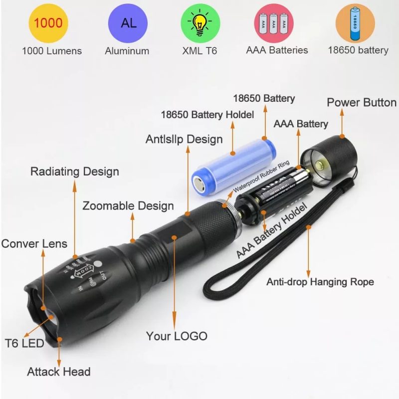 Lampan är av mycket hög kvalité och dessutom vattentålig. Den är extremt ljusstark med en enda LED-diod på 1000 lumen, detta gör att du får ett extremt starkt ljus. Den har även inbyggd zoom, och med hjälp av den så kan man välja om ljusbilden ska lysa starkt några meter bort eller om man vill ha en stark ljusbild på nära håll. Ficklampan har 5 olika ljuslägen att välja mellan; full, medium, och låg ljusstyrka samt strobe och SOS-signal!
