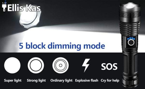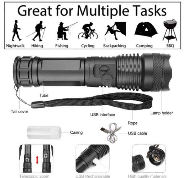 Den senaste generationen av XP50 LED-chip kan producera ultrahög effekt på upp till 2 000 lumen även med en livslängd på upp till 50 000 timmar. Den kraftfulla ficklampan kommer att säkerställa hög lumeneffekt genom värmeavledning och temperaturökning är en normal funktion om det inte fungerar korrekt, ladda det i 1-2 timmar.