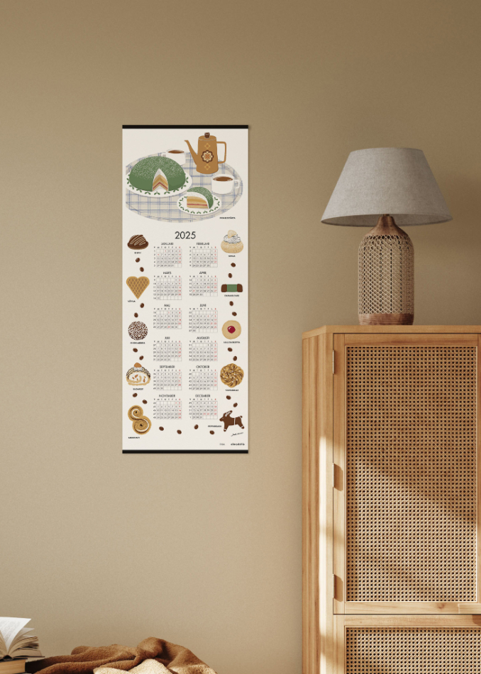 Årstidskalender att hänga på väggen med härliga motiv av bakverk.