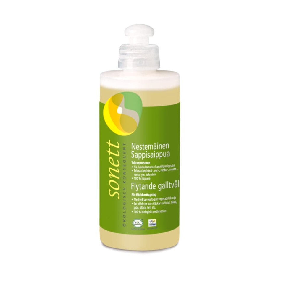 Flytande galltvål som är högeffektiv mot besvärliga fläckar som fett, blod, frukt, bläck etc. Galltvålen kan användas för direkt behandling av fläckar eller som extra rengörare i tvättmaskin. Galltvålen som kommer från Sonett är också biologiskt nedbrytbar.