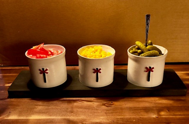Tre dekorativa burkar/krukor i stengods på tillhörande träbräda.