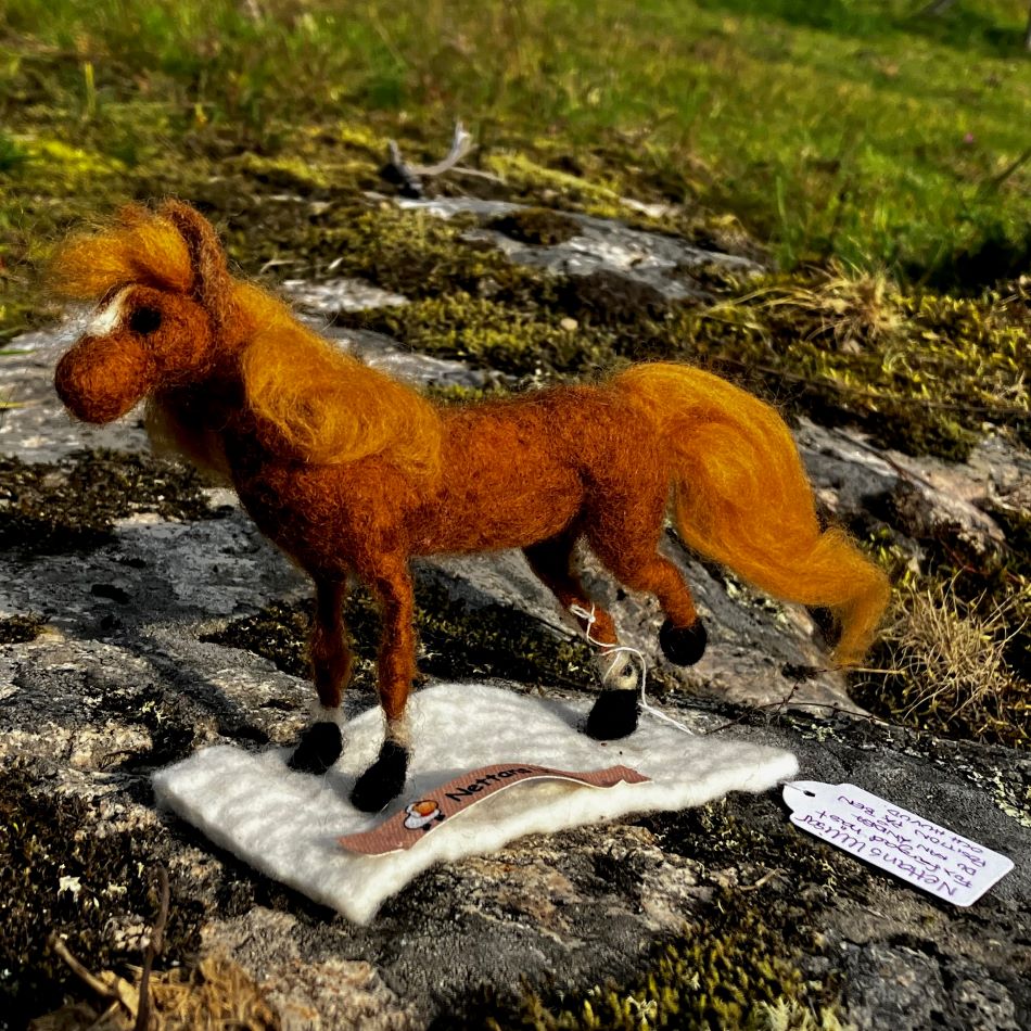 Nåltovad i corriedaleull och vacker mjuk merionull som man och svans. Fuxen är cirka 11 cm hög från huvud till hov och kroppen är cirka 13 cm lång. Design Nettans Ullisar