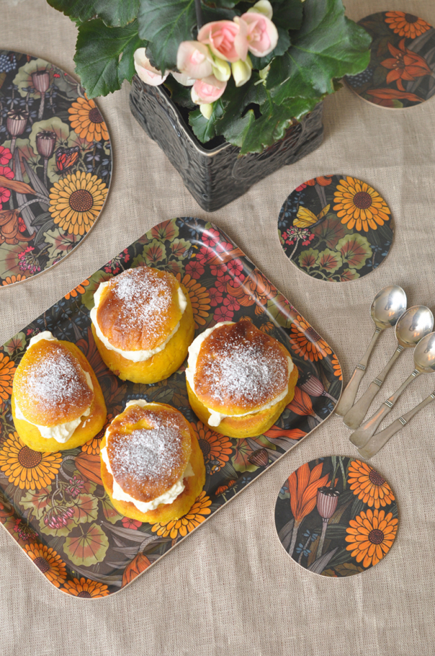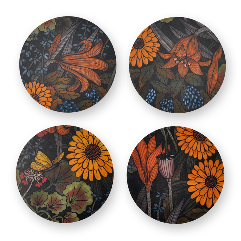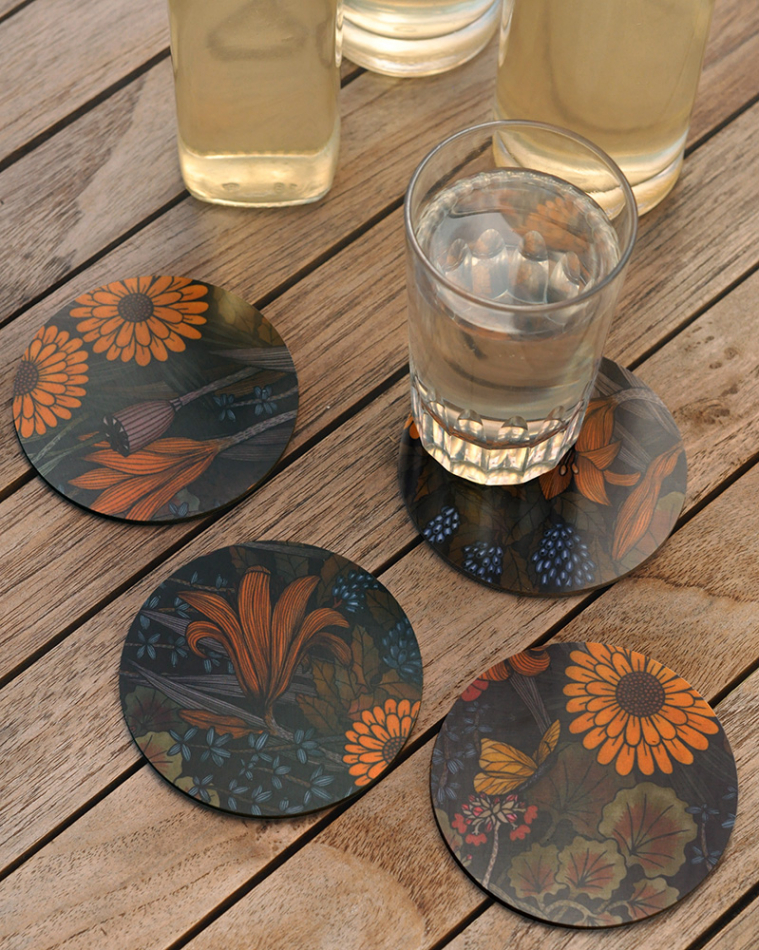 Glasunderlägg i formpressat trä med motiv Ringblomsdans.