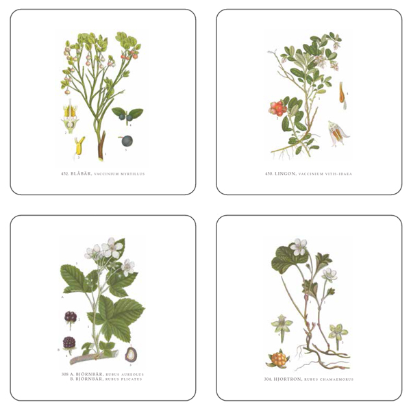 Glasunderlägg i set med 4st botaniska skogsbär illistruerad av C.A.M. Lindman