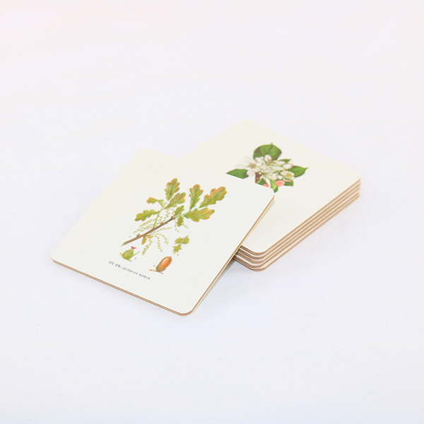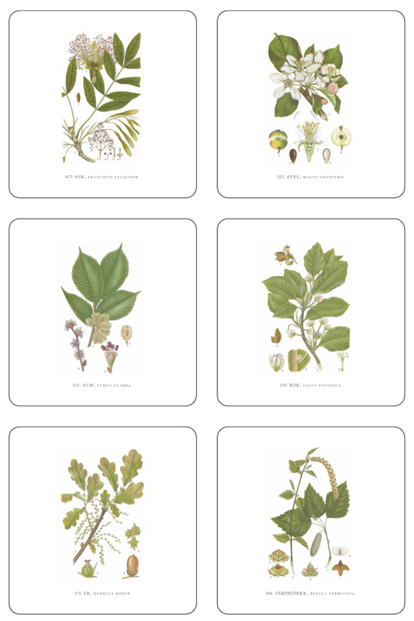 Glasunderlägg i set med 6st botanisk träd illistruerad av C.A.M. Lindman.
