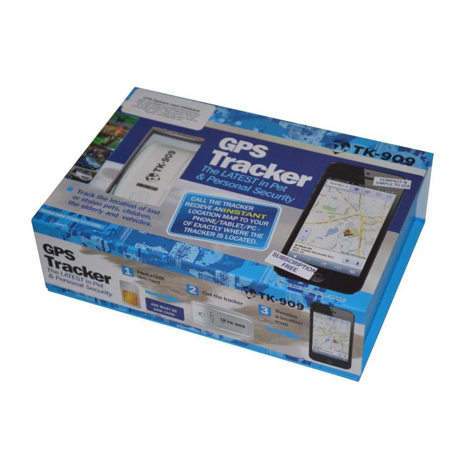Förpackningen innehåller: TK-909 GPS-spårare. Inbyggt laddningsbart 3.7V 1000mAh Li-ion batteri. Batteriladdare. USB kabel. Halsband. SIM-korts adapter. Medlemskap på servern för realtids spårning. App för Android och iPhone. Svensk manual.