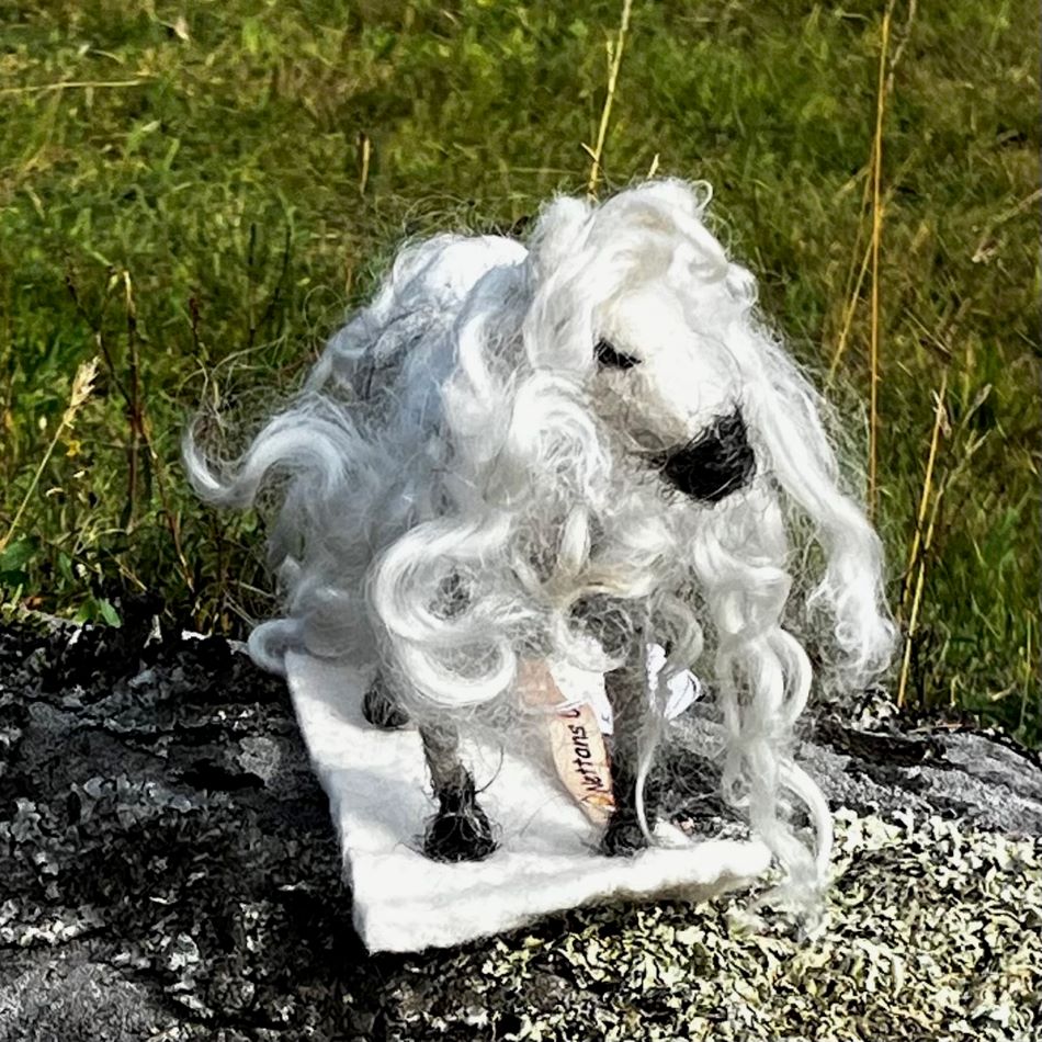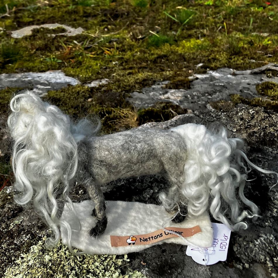 En liten söt häst, handgjord i grå ull och långa vackra vita lockar av svenska leicesterfår. Den perfekta lite annorlunda presenten till någon som älskar ponnies. Ej leksak. Minihästen är cirka 15 cm lång och hög från huvud till hovar cirka 12 cm. Svensk ull såsom, gotlandsull och leicester, stålvajer i kroppen. Design Nettans Ullisar