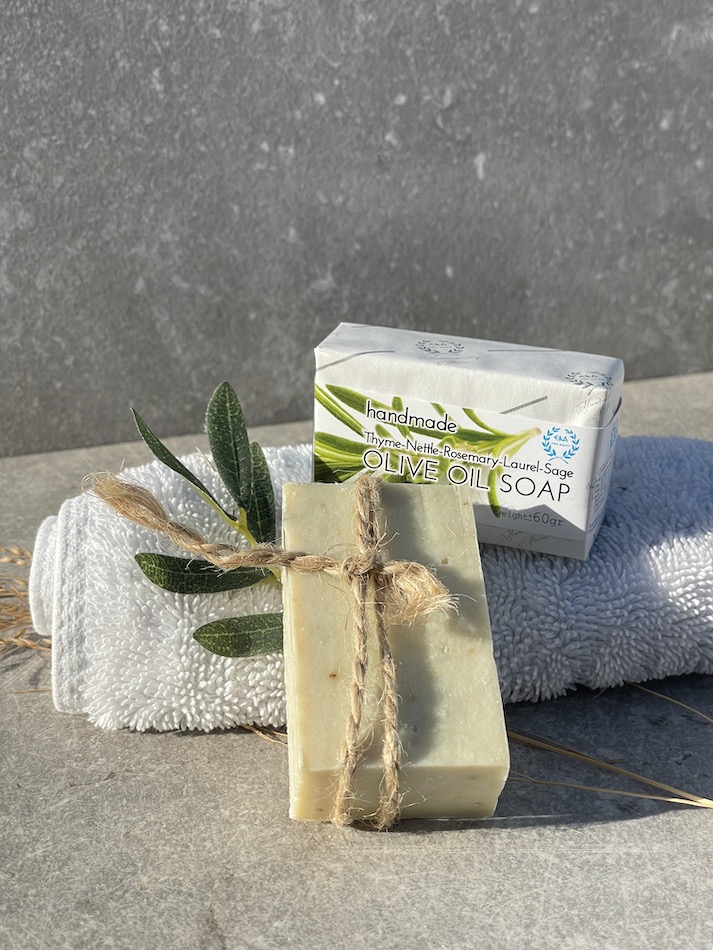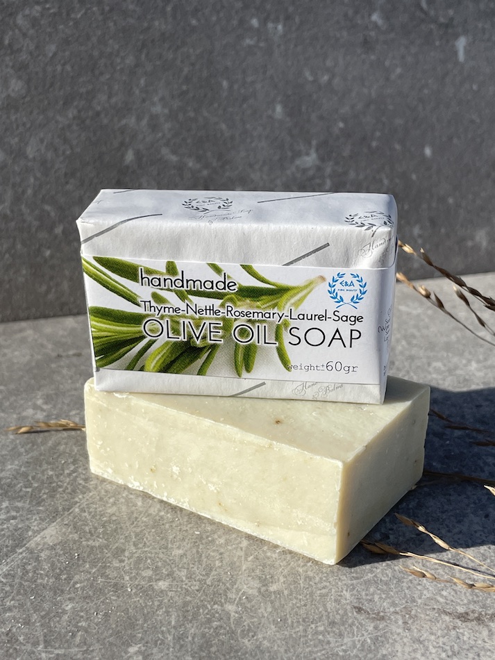 Tvålen innehåller dessa örter: Timjan, Salvia, Laurel, Rosmarin och Nässla.