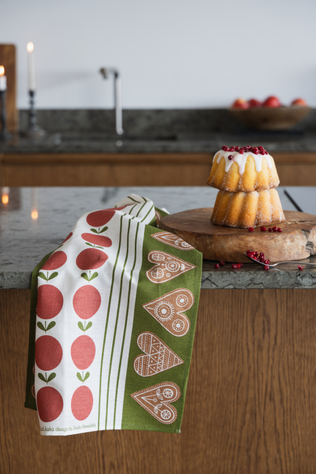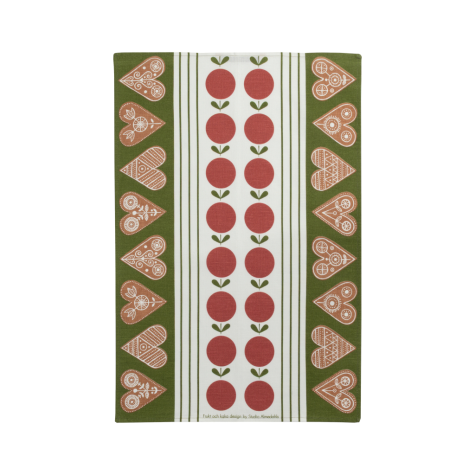 Frukt och kaka är tryckt på halvlinne av hög kvalitet – perfekt till julens bakdagar eller som en stämningshöjare i köket under hela säsongen.