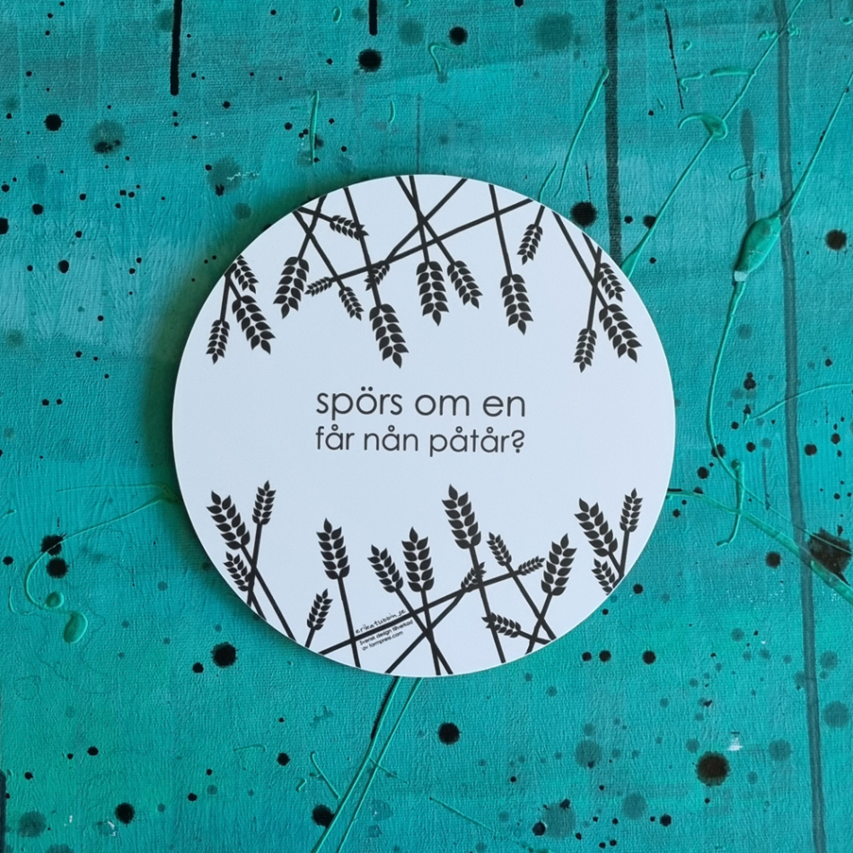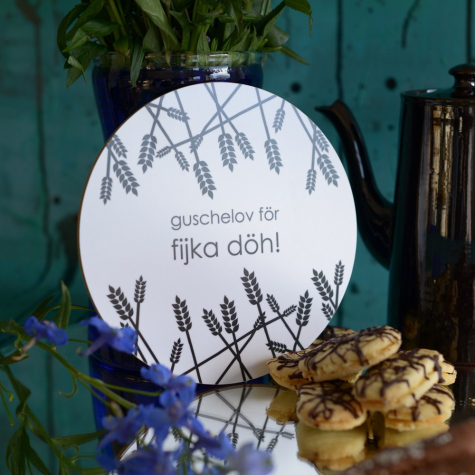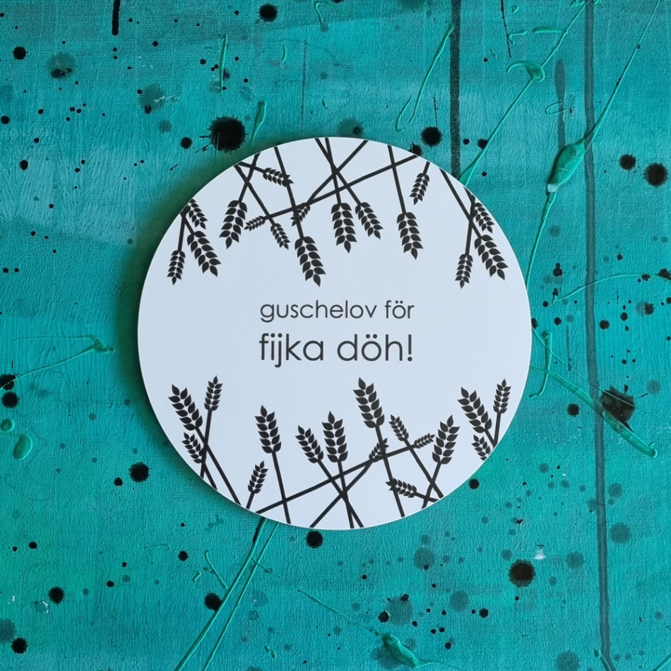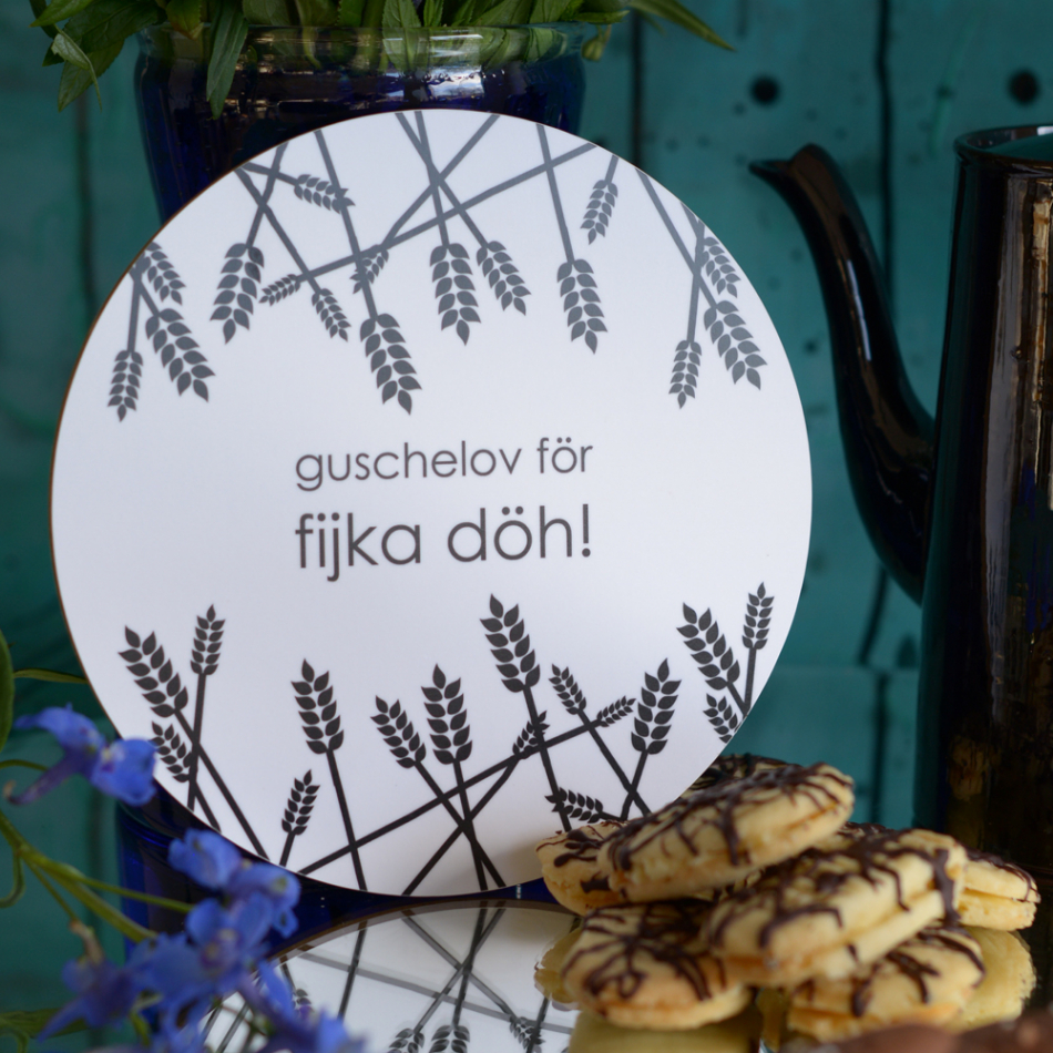 Vändbart grytunderlägg med text "guschelov för fijka!" på ena sidan och "spörs om en får nån påtår?" på den andra. Underlägget hör till erika tubbins kollektion ÖSCHÖTTE GUSCHELOV.