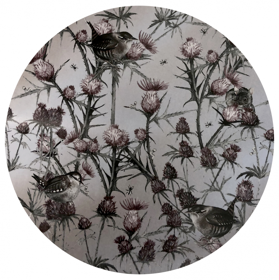 Underlägget med tistlar i lilagrå toner & små fåglar gör sig fint på köksbänken. Det blir en fin inredningsdetalj i ditt hem.