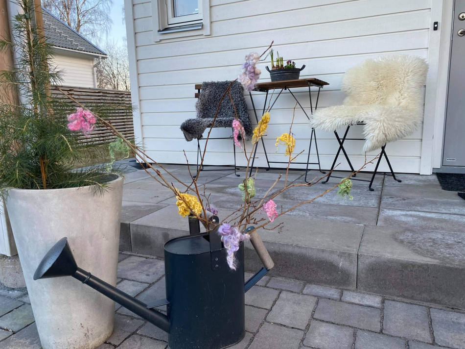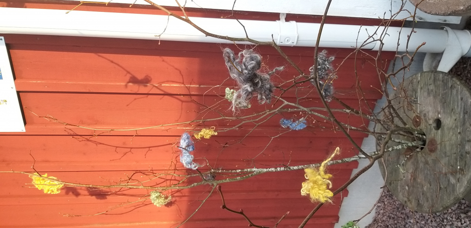 Ullen fungerar lika fint att ha utomhus som inomhus. Inomhus räcker det att lägga/ hänga ullen i så stora krulliga ulltussar du vill ha. Utomhus behöver ullen sättas fast med en liten najtråd, för att stannakvar i riset. Ullen ser likadan ut även om den skulle bli blöt av regn.