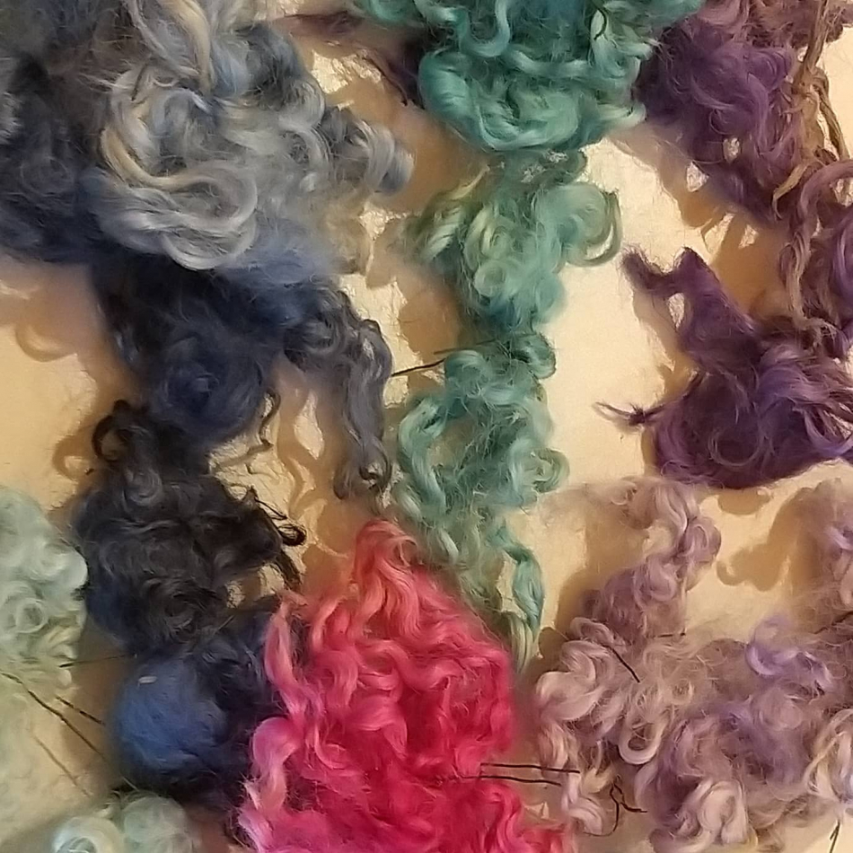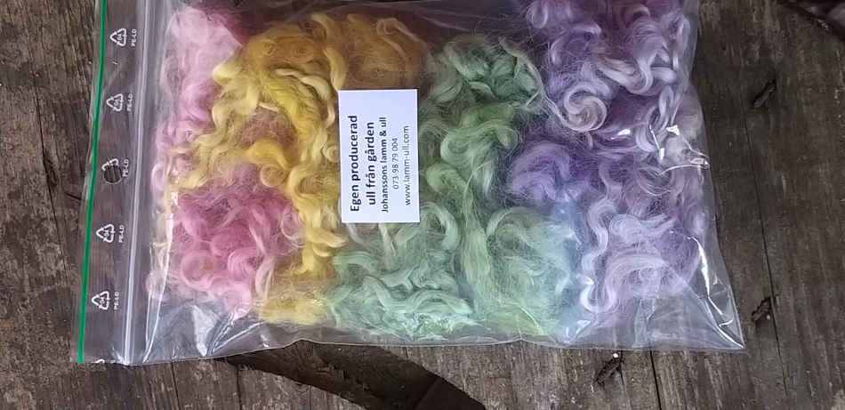 Ullpåsarna innehåller 3-4 olika färger, färger och lockighet på ullen varierar i påsarna.