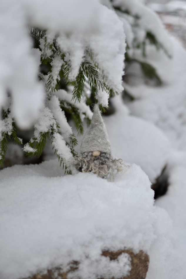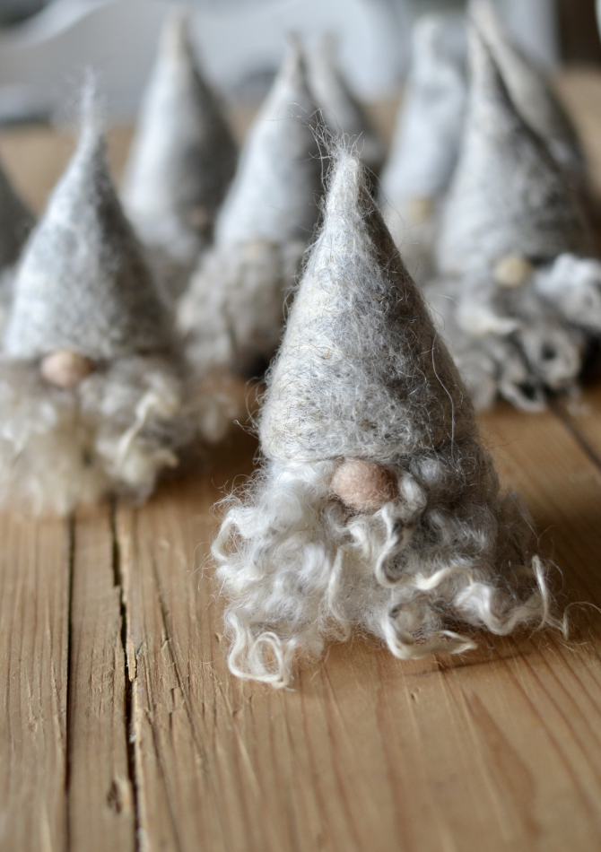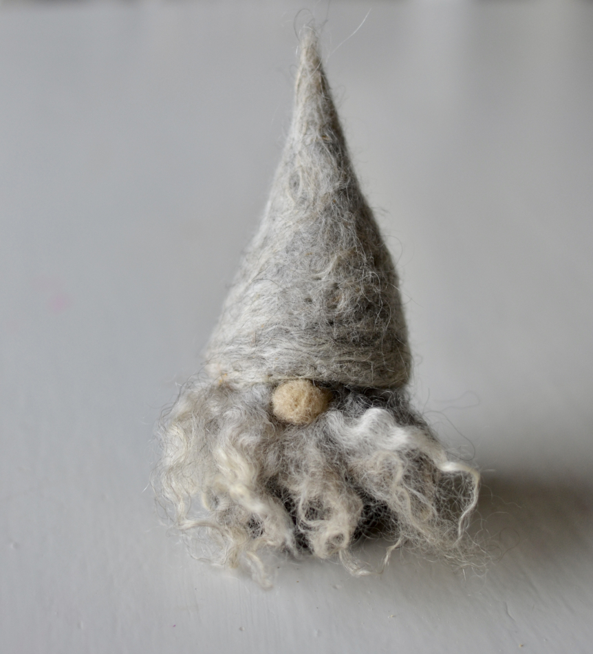 Tovad ullvätte med lockigt skägg och ljusgrå luva. All ull är svensk och räddad från att kastas.